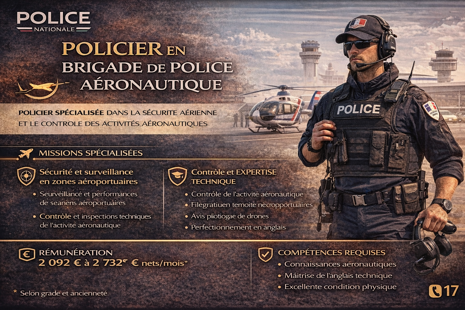 Le policier affecté en Brigade de Police Aéronautique (BPA) au sein de la Police nationale exerce des missions spécialisées liées à la sécurité aérienne et aux activités aéronautiques.